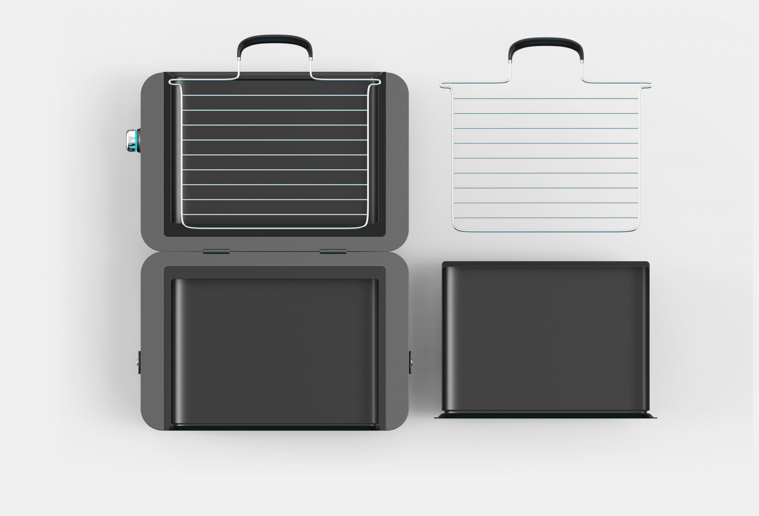 TC-roaster便攜烤箱分類: 產品作者:廈門長臂猿設計2023年10月19日 設計理念/Design concept TC-roaster便攜烤箱采用擬物式設計,以旅行箱為外觀意向,以便捷使用收納為結構交互設計核心,讓烤箱產生了一種隨行隨心的方便感。